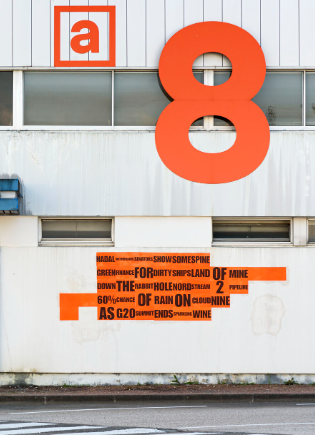 Printed at large scale, the poems are directly pasted onto the walls, like posters. The shapes they create, lines, blocks, silhouettes, oscillate between the organic and the mechanical, echoing both industrial precision and the freedom of language. The works are encountered along everyday pathways: outdoors and in interior spaces.